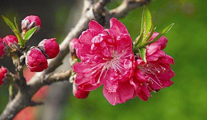 桃花,屬薔薇科,落葉小喬木,高可達(dá)6一8米。樹干灰褐色,粗糙有孔。小枝紅褐色或褐綠色,平滑。葉橢圓狀披針形,邊緣有細(xì)鋸齒。花單生,有白、粉紅、紅等色,重瓣或半重瓣,花期3月。核果近球形,表面密被短絨毛,因品種不同,果熟6一9月。